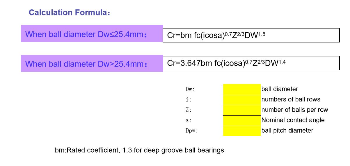 The basic rated dynamic load refers to the constant radial load that a deep groove ball bearing can withstand for 10^6 revolutions with a 90% reliability rate. The calculation formula is divided into two cases according to the diameter of the steel ball: