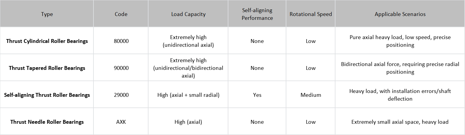 - Thrust cylindrical/tapered/needle roller bearings: No self-aligning ability, requiring strict installation coaxiality.