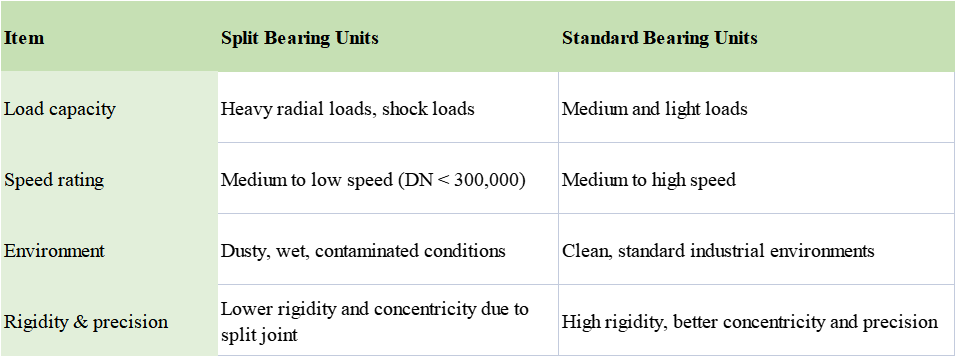 Choose split bearing units if the shaft cannot be removed, downtime is costly, or under heavy-duty harsh conditions.